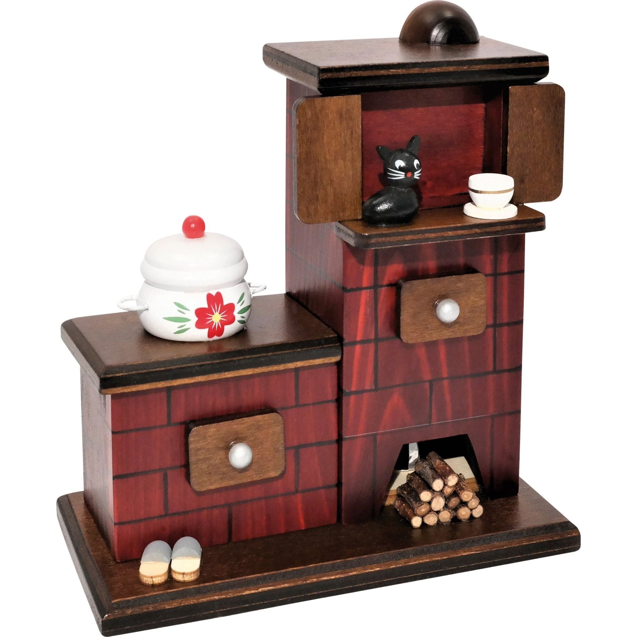 The smoker is very rustic and offers many small details such as a stack of logs, a small cat and a cooking pot. To use, simply lift the oven from the solid base, insert the incense candle and light it. Then just put the stove back on and watch the smoke rise up the chimney .