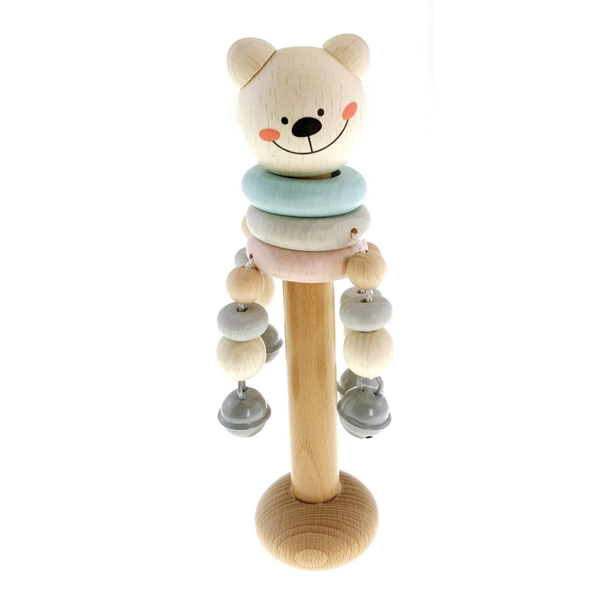 The wooden bell stick with its cute bear head in delicate pastel colors and the small bells is a lovingly made wooden toy for children aged 3 and over .