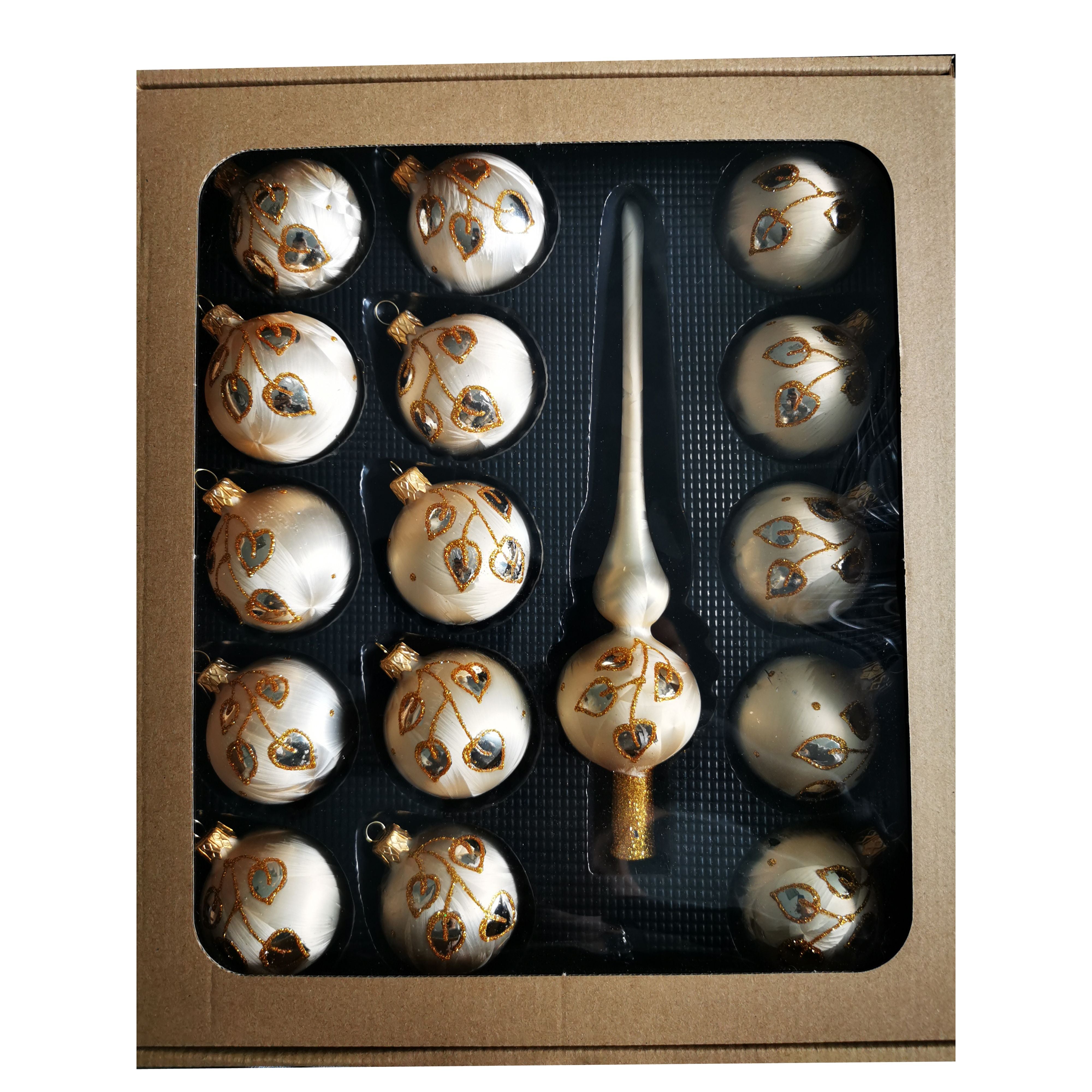 The 16-piece glass ball assortment is mouth-blown and hand-decorated. This makes your Christmas tree an elegant eye-catcher.