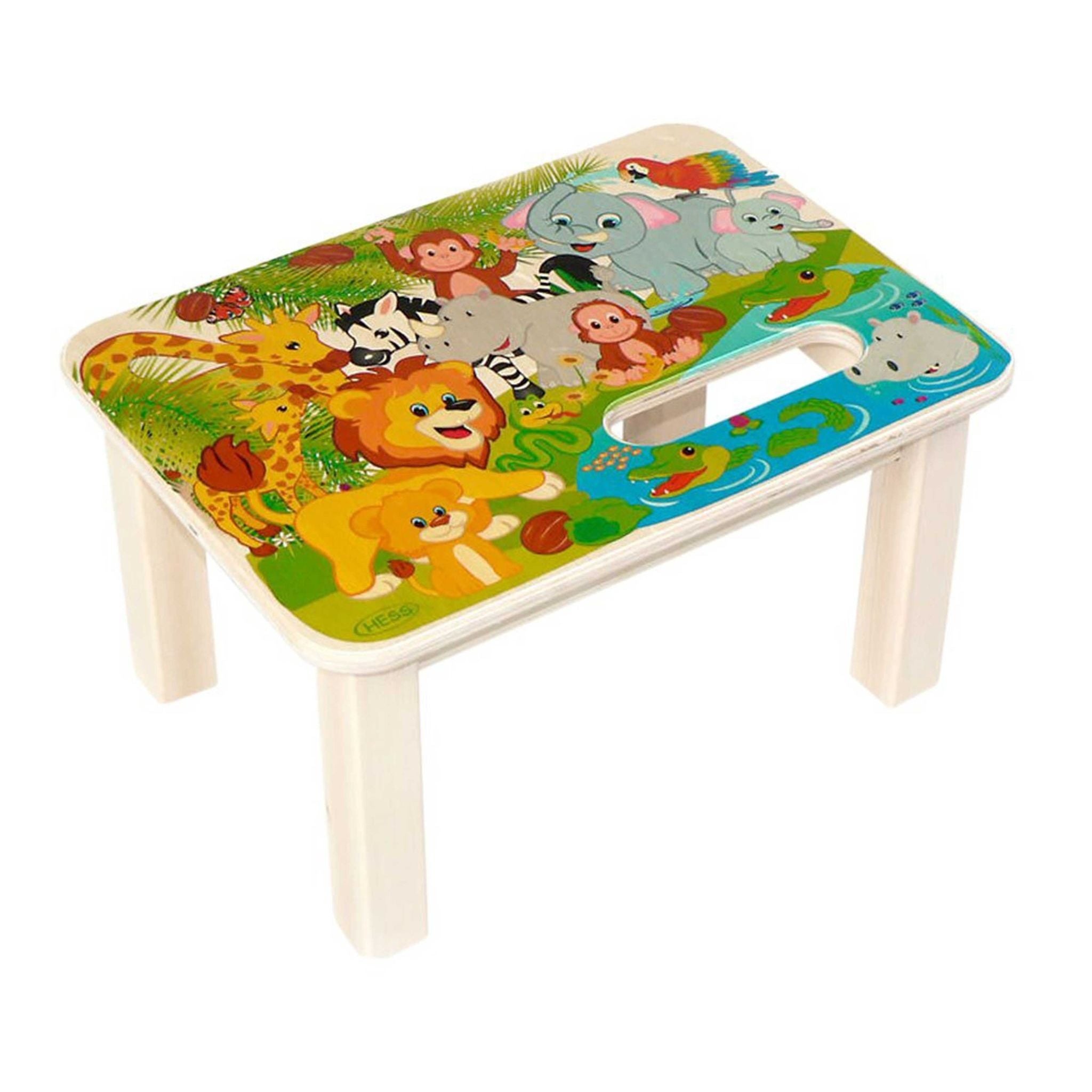 A footstool with a whole colorful jungle and the animals that go with it, such as lions, elephants, monkeys, zebras, giraffes and hippos. Brushing your teeth is much more fun with such companions.