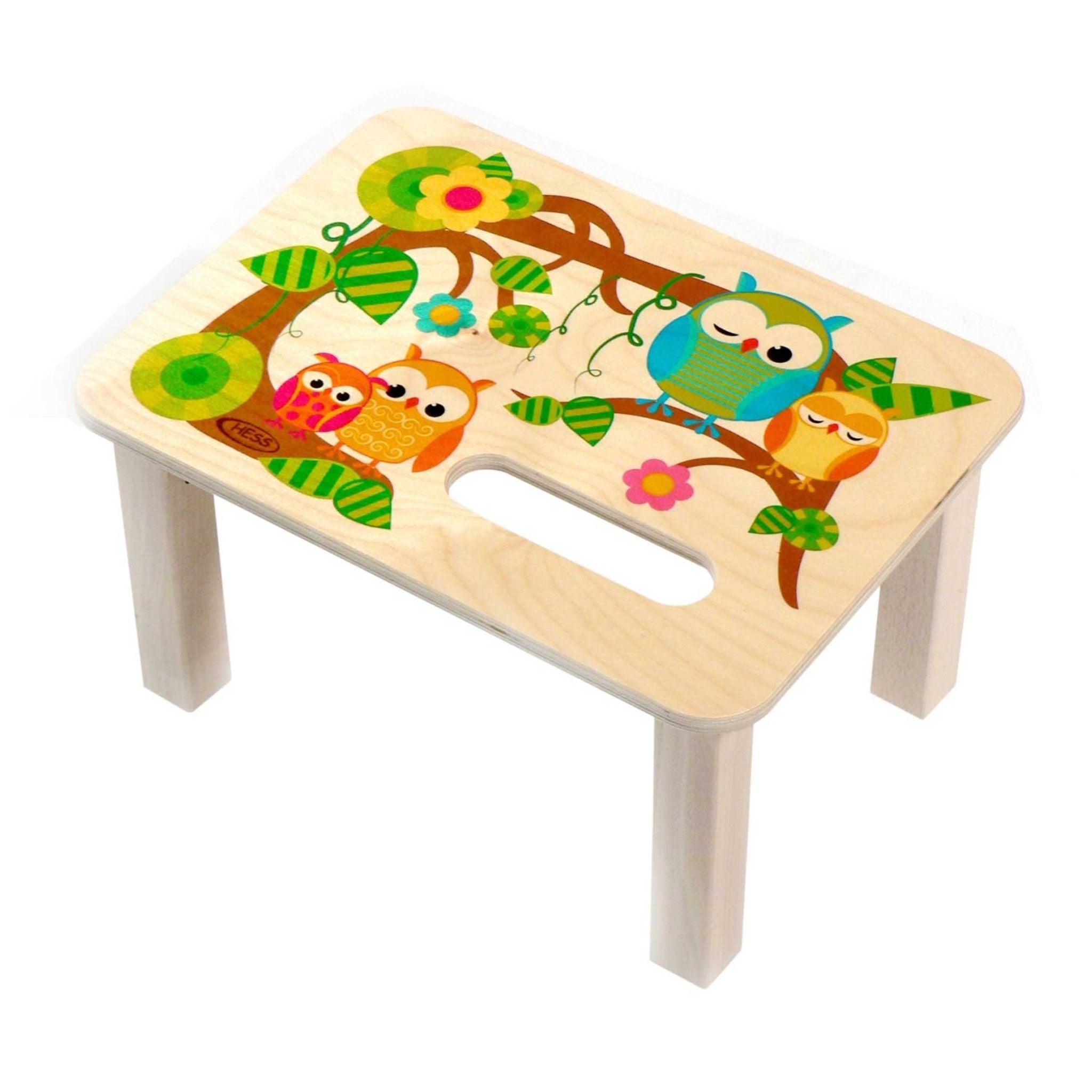 Owls are an ever-popular motif among children and parents. This is exactly the motif that adorns this footstool . These colorful owls make many things easier, whether brushing your teeth or putting on your shoes.