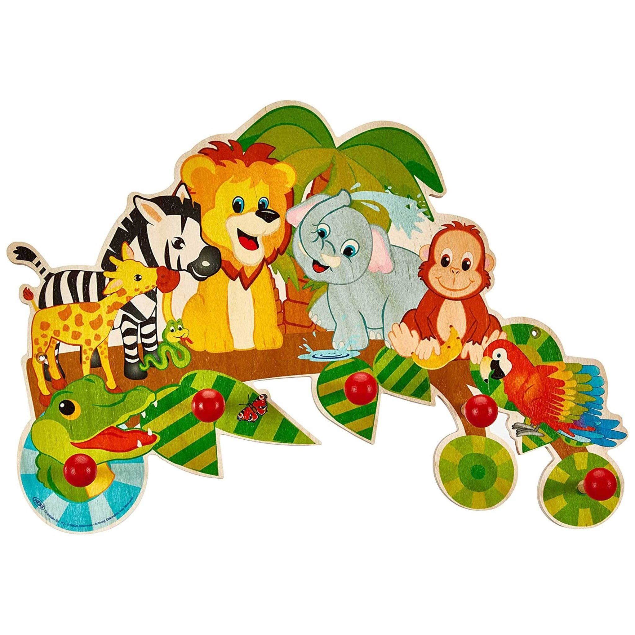 The jungle themed wardrobe is the perfect solution for children's clothing. It impresses not only with its colorful design, but also with its high-quality woodwork. Made in Germany, it stands for quality and durability. With a total of five coat hooks, this coat rack offers enough space for hanging jackets or bags. Every single hook has been carefully attached and can easily withstand the weight of the garments.