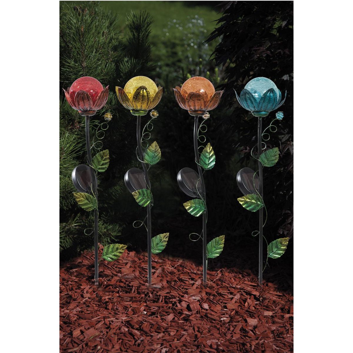 The solar garden stake "Flower" with integrated LED solar lighting is a must for every garden lover. Beautify green spaces, balconies and terraces at any time of the year. The garden stakes in an artistic flower design create small, mysterious oases of light. The weather-resistant mix of metal and glass looks elegant and stylish. The garden stake is available in red, yellow, orange and blue. An integrated solar battery makes it possible to use it without an external power source. Simply plug it into the garden, planter or balcony pot, switch it on and you're done. The diameter of the flower is about 10 centimeters.
