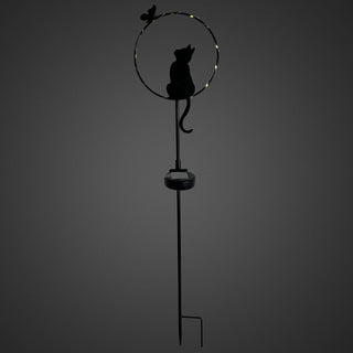 Gartenstecker aus schwarzem Metall mit stehender Katzen‑Silhouette in einem runden Rahmen. Die Katze streckt sich zu einem kleinen Schmetterling am oberen Rand des Kreises. Ein integrierter Solar‑LED‑Lichtdraht beleuchtet den Kreis dezent. Am Metallstab befindet sich das Solar‑LED‑Modul. Gesamthöhe 84 cm, freistehend vor dunklem Hintergrund.
