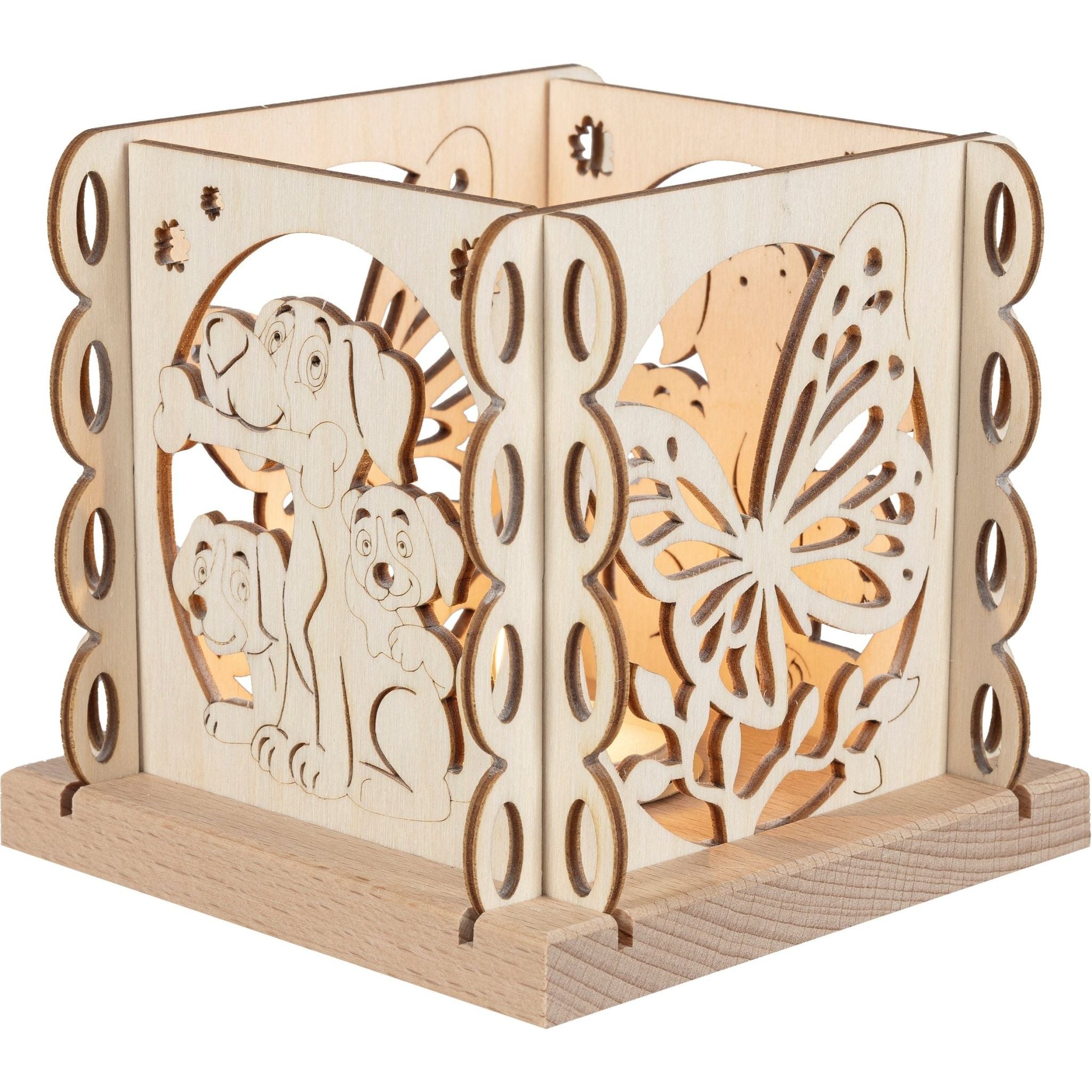 Der Kerzenhalter "Hundefreund" ist ein bezauberndes Deko-Element für alle, die Hunde lieben. Gefertigt aus Holz, zeigt er auf seinen vier Seiten drei niedliche Hündchen, die fröhlich miteinander spielen. Einer der kleinen Vierbeiner hält stolz einen Knochen im Maul, während eine andere Seitenfläche einen zarten Schmetterling zeigt. Ein Teelicht im Inneren sorgt für warmes Licht, das die liebevoll gestalteten Motive stimmungsvoll in Szene setzt – ideal für Wohnzimmer, Flur oder als Geschenk für Hundefans.