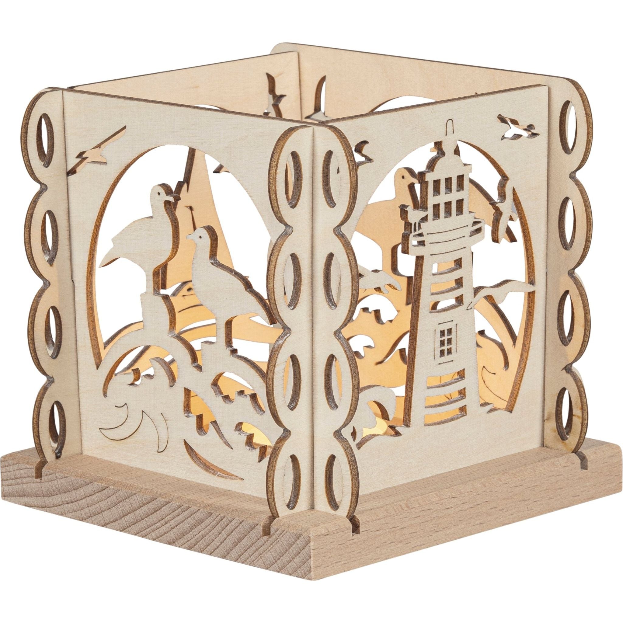 Der liebevoll gestaltete Teelichthalter / Laterne "Küstenliebe" bringt das maritime Flair der Küste direkt in Ihre Wohnwelt. Mit einer Höhe von 12 cm und gefertigt aus natürlichem Holz, zeigt dieses Deko-Highlight detailreiche Motive wie Leuchtturm, Möwen, Boot und Wellen. Die warme Ausstrahlung des Kerzenlichts in Kombination mit dem maritimen Design schafft eine stimmungsvolle Atmosphäre – perfekt für Wohnzimmer, Bad oder als Tischdeko im Sommerhaus.