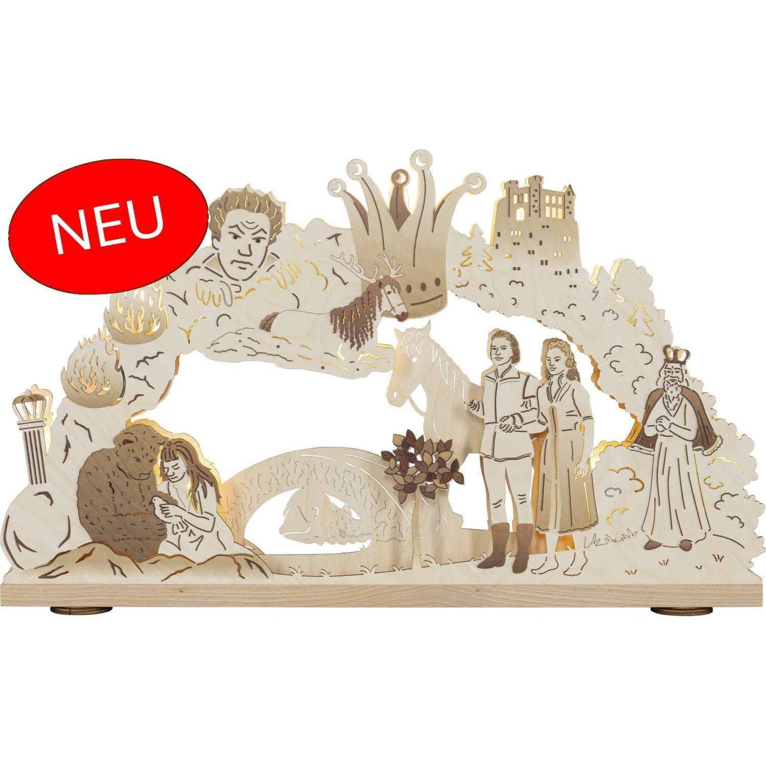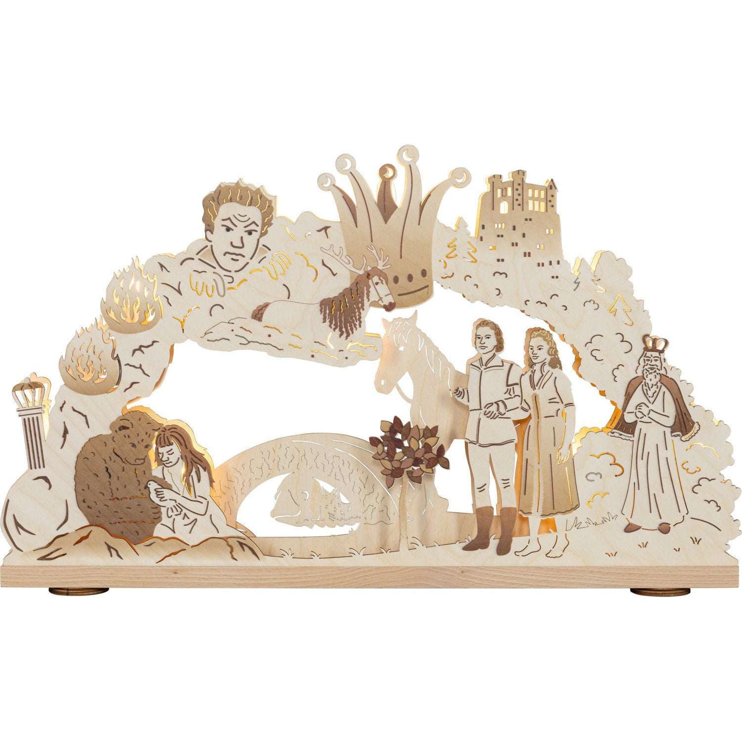 Dieser wunderschöne Schwibbogen aus Holz ist mit einer 10-flammigen LED-Beleuchtung ausgestattet. In der Mitte des Bogens befinden sich die Prinzessin mit dem Prinzen und seinem Pferd, der Fisch, den die Prinzessin gerettet hat und das singende klingende Bäumchen. Diese liebevoll gestalteten Details machen den Schwibbogen zu einem echten Blickfang.