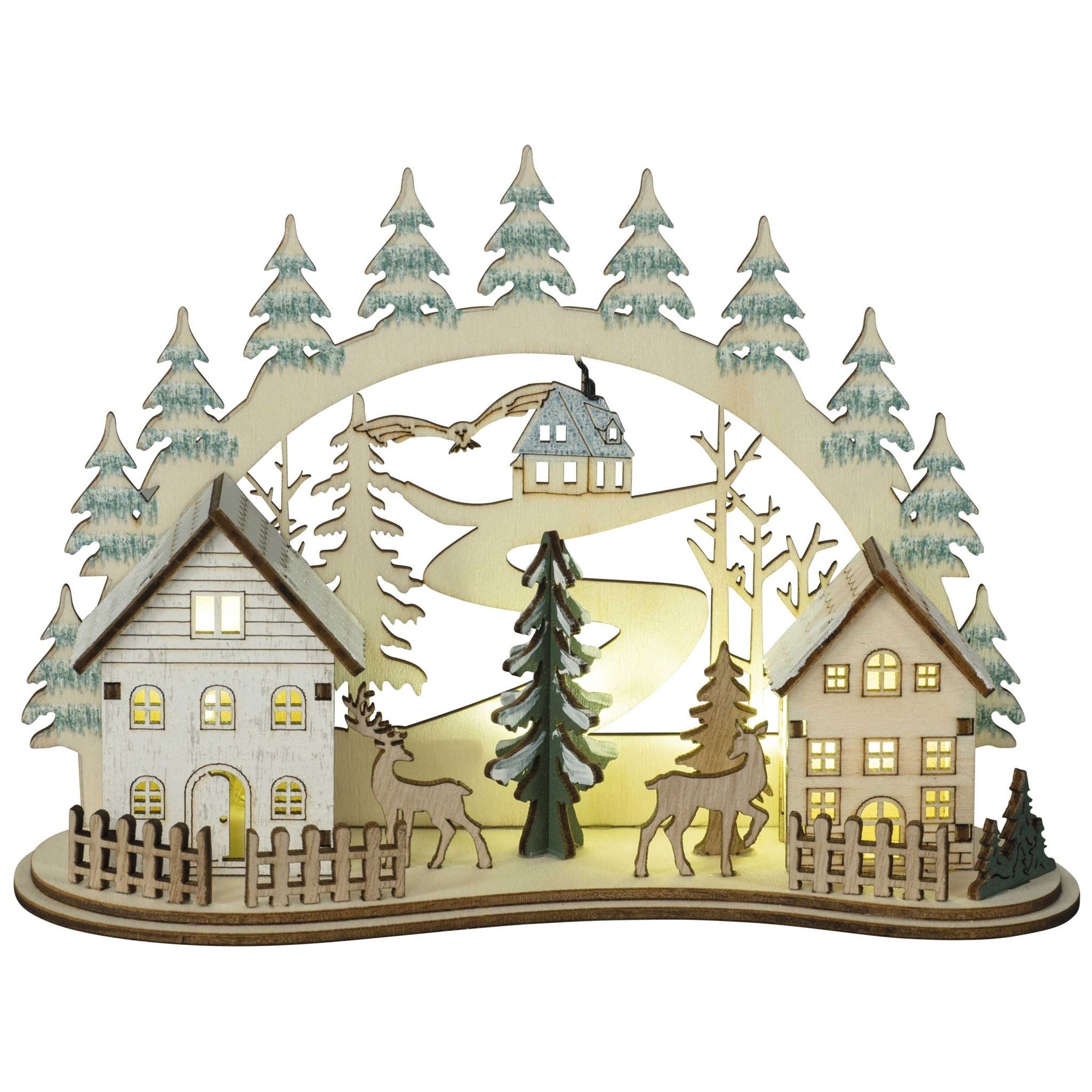 This 3D light arch is a decorative light that glows pleasantly and impresses with its colorful accents. It is battery operated and has a timer, so all you have to do is turn it on and it will automatically turn off again. The LED technology ensures a long service life and low power consumption. 2 motifs available: Christmas market or city .