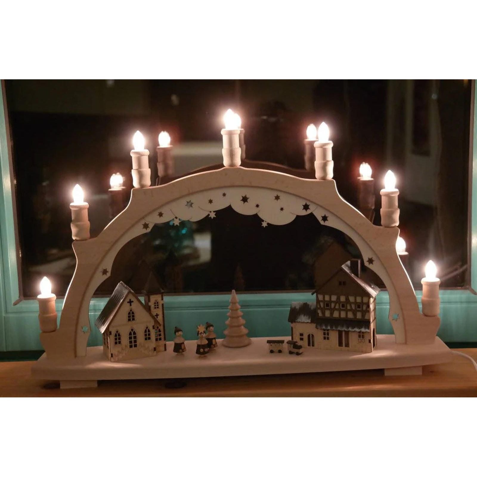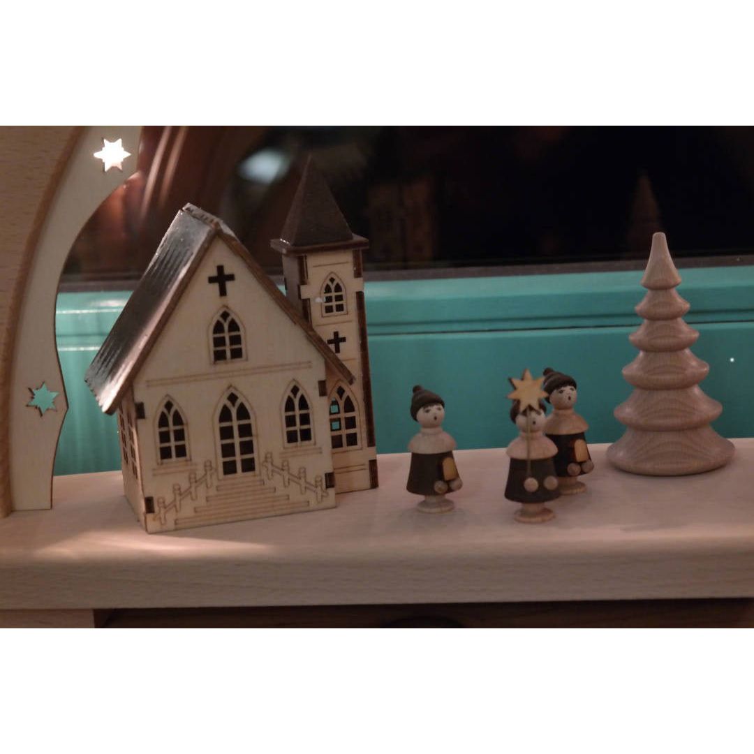 7 candle-shaped lights illuminate this beautiful light arch. Made in the Erzgebirge, it enchants lovers of playful decorations, both young and old, during the Advent and Christmas seasons. The base and arch are made of solid beech wood. Inside, two historic buildings, depicted in great detail, dominate the motif - the church on the left and the train station on the right, in front of which the train has just pulled up. Carol singers, three turned figures, have come to sing in the middle of the square by the Christmas tree. With a multicolored contrast, the light arch is a real eye-catcher on the windowsill. The LED lighting and the cable with switch for the mains power are included. You can find replacement bulbs and light arch pedestals in our online shop.
