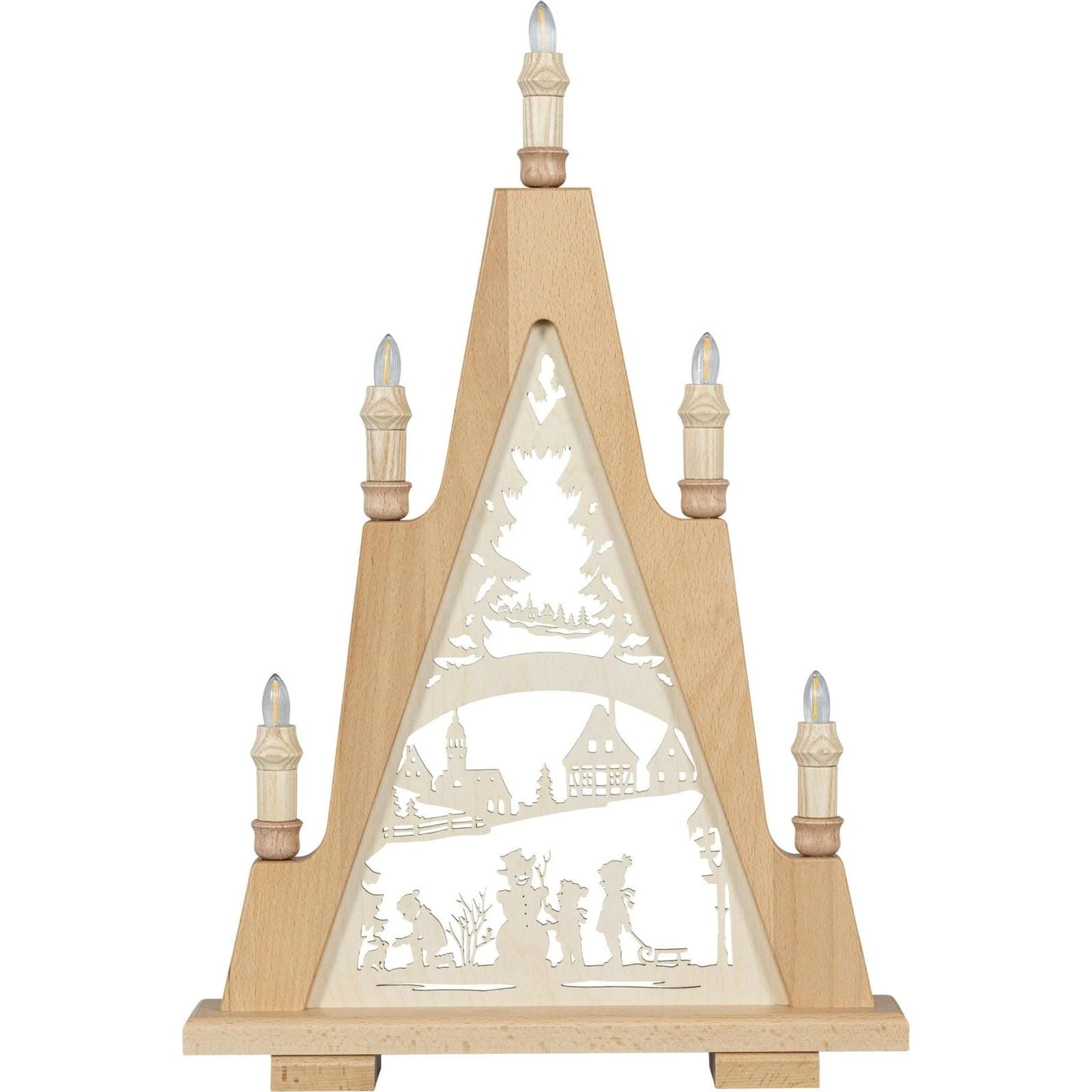 Heute bestehen Schwibbögen meist aus Holz und zeigen kunstvoll geschnitzte Szenen: Bergleute, Engel, Waldtiere oder winterliche Dorflandschaften. Die warmen Lichter schaffen eine gemütliche Atmosphäre und sind Ausdruck erzgebirgischer Handwerkskunst.