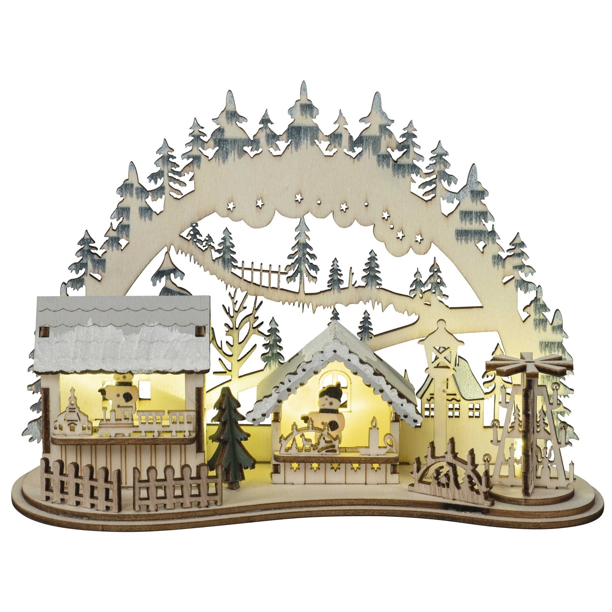 This 3D light arch is a decorative light that glows pleasantly and impresses with its colorful accents. It is battery operated and has a timer, so all you have to do is turn it on and it will automatically turn off again. The LED technology ensures a long service life and low power consumption. 2 motifs available: Christmas market or city .