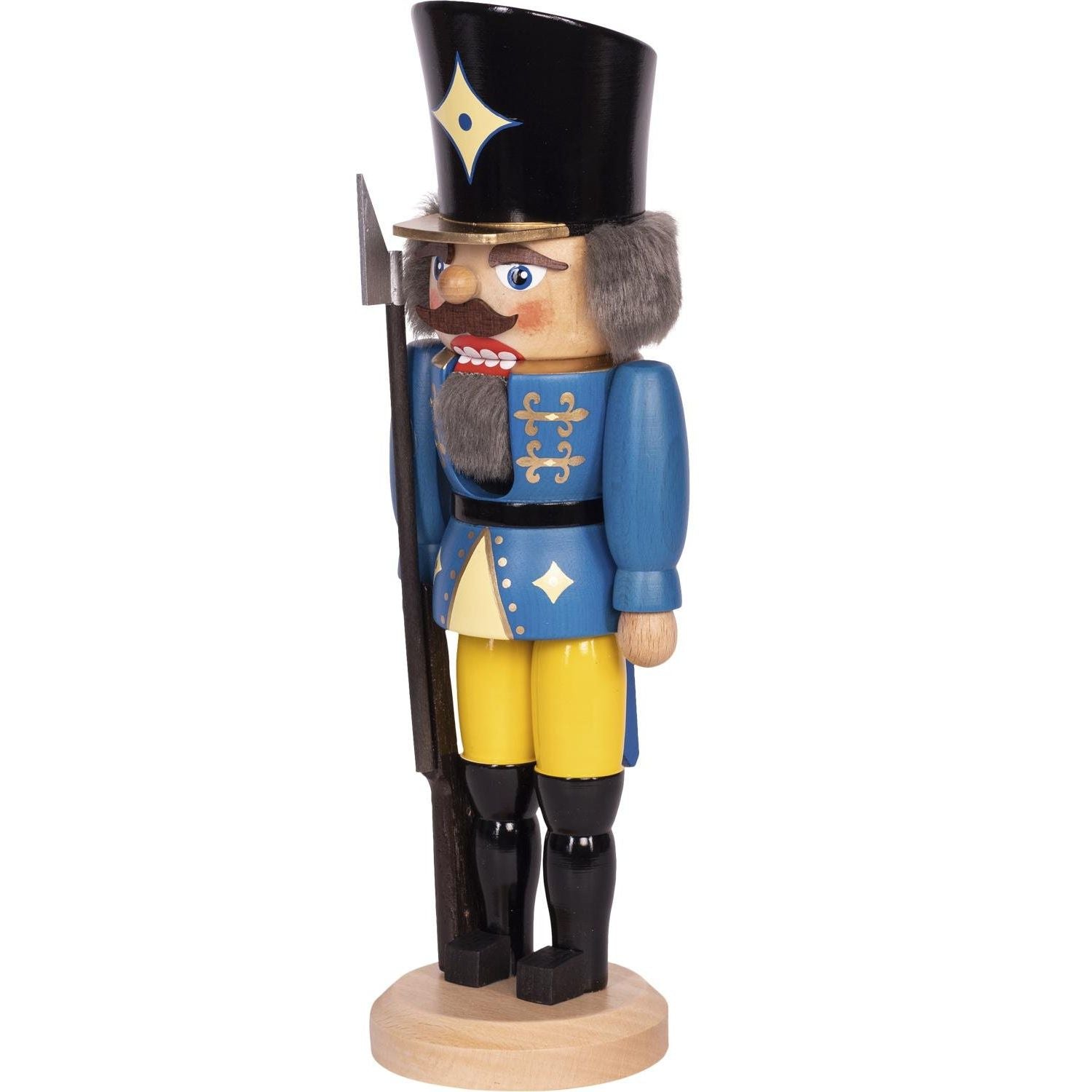 The Nutcracker "Soldier" is one of the classic Christmas characters. It is an integral part for all lovers of the traditional German Christmas. It is manufactured in an artisan factory in the Erzgebirge. The individual parts, turned from high-quality wood, are painted and then glued together. We offer the nutcracker in the traditional colors white, red and blue, as well as in sizes 29 and 36 cm. The decorations and the face of the figure are carefully applied; it is wooden art from the Erzgebirge. The nutcracker is not suitable for cracking nuts, but is used for decorative purposes.