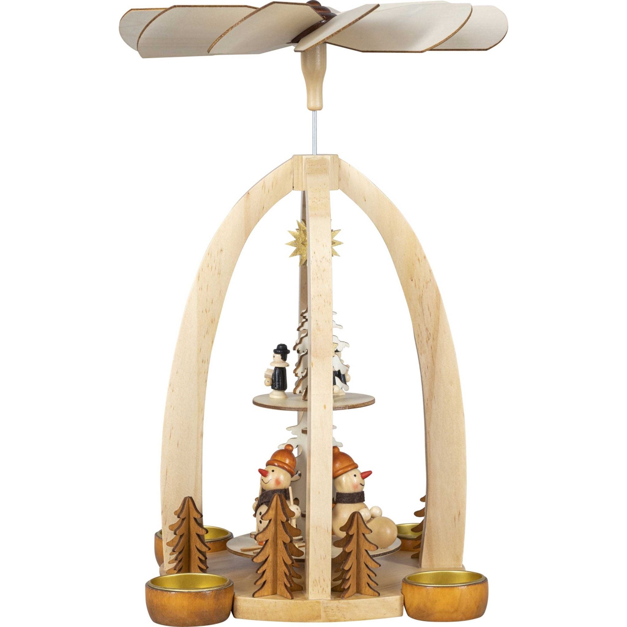 The Christmas pyramid is a beautiful Christmas decoration that is placed in many households. It is made of wood and has dimensions of 18.5 × 18.5 × 30 cm. It can be equipped with 4 tea lights and is available in “winter sports” and “snowmen” motifs.