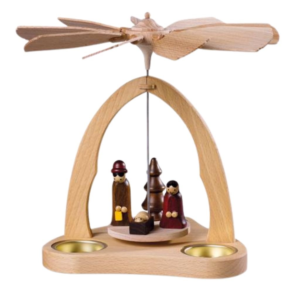 Mit Kerzen oder elektrischer Beleuchtung sorgen sie für Licht, Wärme und Besinnlichkeit. Ihr Ursprung liegt in der erzgebirgischen Handwerkskunst und der Tradition des Bergbaus. Das Flügelrad wird durch aufsteigende Wärme angetrieben und setzt die Ebenen in Bewegung. Gefertigt aus Holz, sind sie in vielen Größen und Designs erhältlich – von schlicht bis kunstvoll.