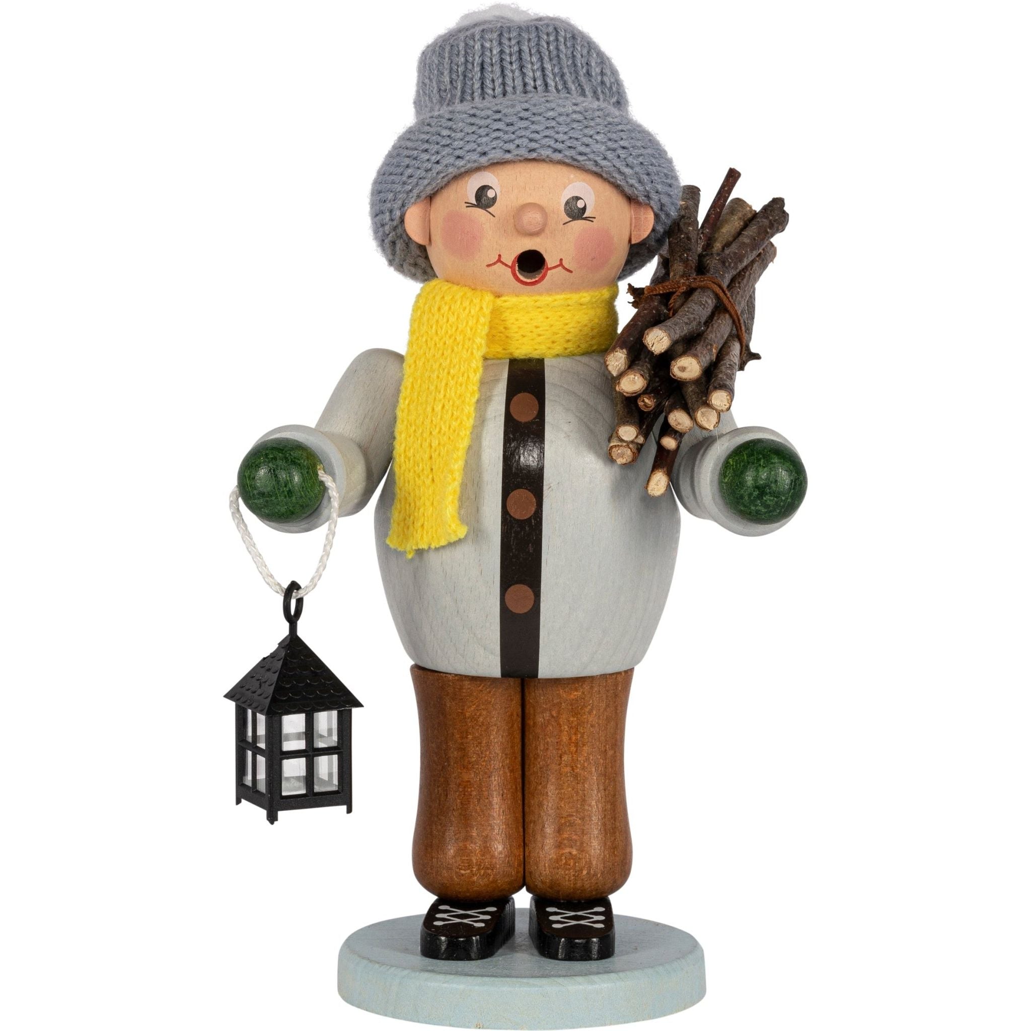 The incense smoker "Winter Child" is quite impressive with its size of 23 cm . The incense smoker, made in the Erzgebirge, will certainly complement your existing collection of incense smokers. The motif suits the frosty winter. When it finally gets cold here in the Erzgebirge, it's time to play outside in the snow or practice popular winter sports. It gets dark early, especially in the evenings in winter, so the motif shows the child going outside again with a lantern. It gets a little bit of wood for a cozy evening by the fireplace with the family. Of course, wrapped up warm with a knitted scarf and hat.