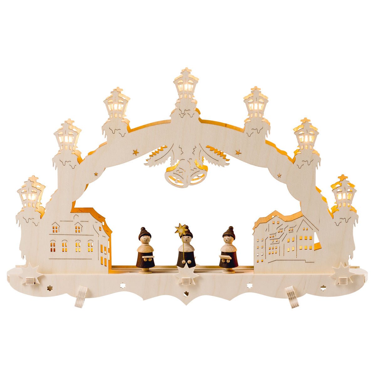 Zum einen haben wir den edlen Mix aus hellem und dunklem Sperrholz, zum anderen verbinden die drei gedrechselten Sängerfiguren die Ebenen des 3D Lichterbogens perfekt. Die innen verlegte Beleuchtung ist inklusive. Wechsellampen erhalten Sie in unserem Zubehörshop. Am besten gleich vorsorgen und mit bestellen.