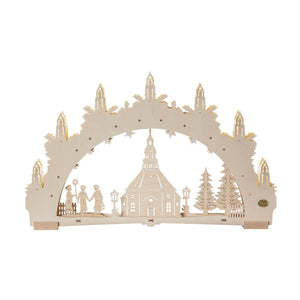 Bei unserem 3D-Schwibbogen "Seiffener Kirche" ist es gerade das schlichte und elegante Design, was den Charakter diesen schönen Stückes bestimmt. Nichts Anderes würde auch zu diesem weltberühmten Motiv passen. Die kleine Seiffener Rundkirche steht für Demut und Armut der einfachen Bevölkerung im Erzgebirge. So steht das Wahrzeichen von Seiffen auch im Zentrum des Schwibbogens. Drei Sänger daneben bereiten sich auf eine musikalische Einlage vor. Überspannt wird die Szene von 7 festlich geschmückten und filigran gearbeiteten Kerzen, hinten denen die elektrischen LED-Lampen strahlen. Wie bei 3D Schwibbögen typisch, sind die Lampen gut im Inneren versteckt. Die Wirkung des Lichterbogens im Dunkeln ist einmalig. Lassen Sie sich überraschen! Für den Betrieb ist eine Steckdose nötig. Made in Germany!
