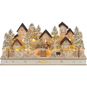 Das LED Weihnachtsdorf ist eine beeindruckende Weihnachtsdekoration, die mit ihren handgeschnitzten Tieren und vielen beleuchteten Häuschen eine besondere Atmosphäre schafft. Vier Rehe, eine Futterkrippe, eine Figur mit Schlitten und zahlreiche beschneite Tannenbäume sorgen für die richtige Weihnachtsstimmung und machen das Dorf zu einem echten Blickfang.