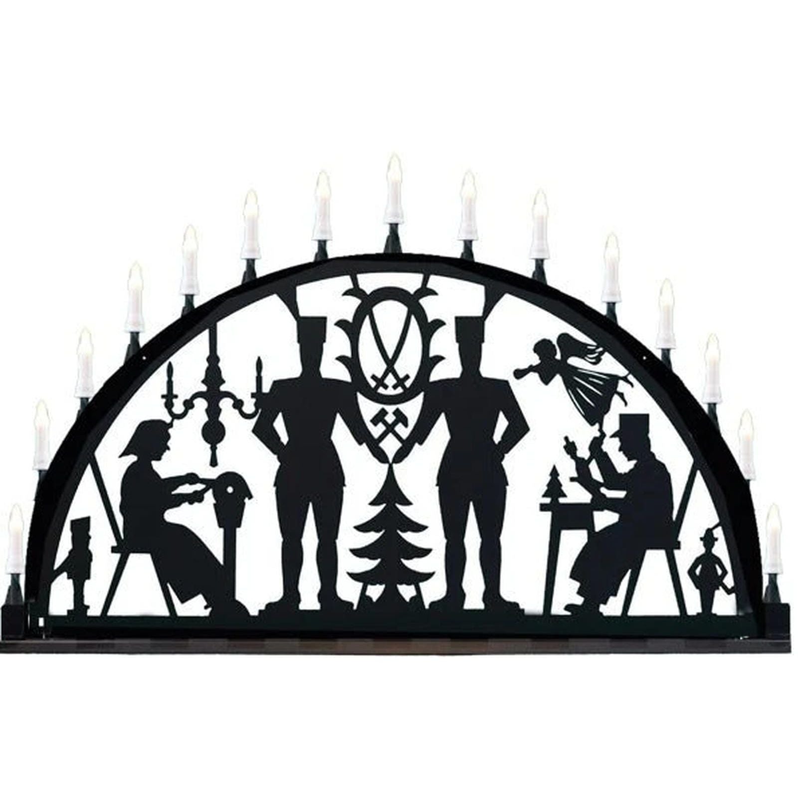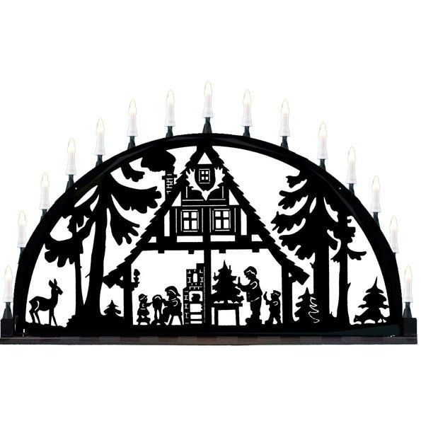 Auch Metallschwibbögen haben im Erzgebirge bereits eine lange Tradition. Der aus Aluminium bestehende Schwibbogen ist für den Außenbereich geeignet. Mittels der im Lieferumfang enthaltenen Erdspieße kann der Metallschwibbogen im Garten frei stehend aufgestellt werden. Ebenfalls im Lieferumfang enthalten ist die 15-flammige Lichterkette für die Größe 1,5m mit IP44 Standard (geeignet für den Außen- und Innenbereich). Wunderbar warmweiße Beleuchtung, die für ein traditionell weihnachtliches Ambiente sorgt, können Sie gezielt in Ihrem Garten und vor Ihrem Haus platzieren. Der Schwibbogen beeindruckt durch das Prädikat „Qualität aus dem Erzgebirge“ und ist ein Stück Handwerkskunst „Made in Germany“. Der Schwibbogen ist in den Motiven "Wald", "Waldhaus" oder "Bergmann" verfügbar.
