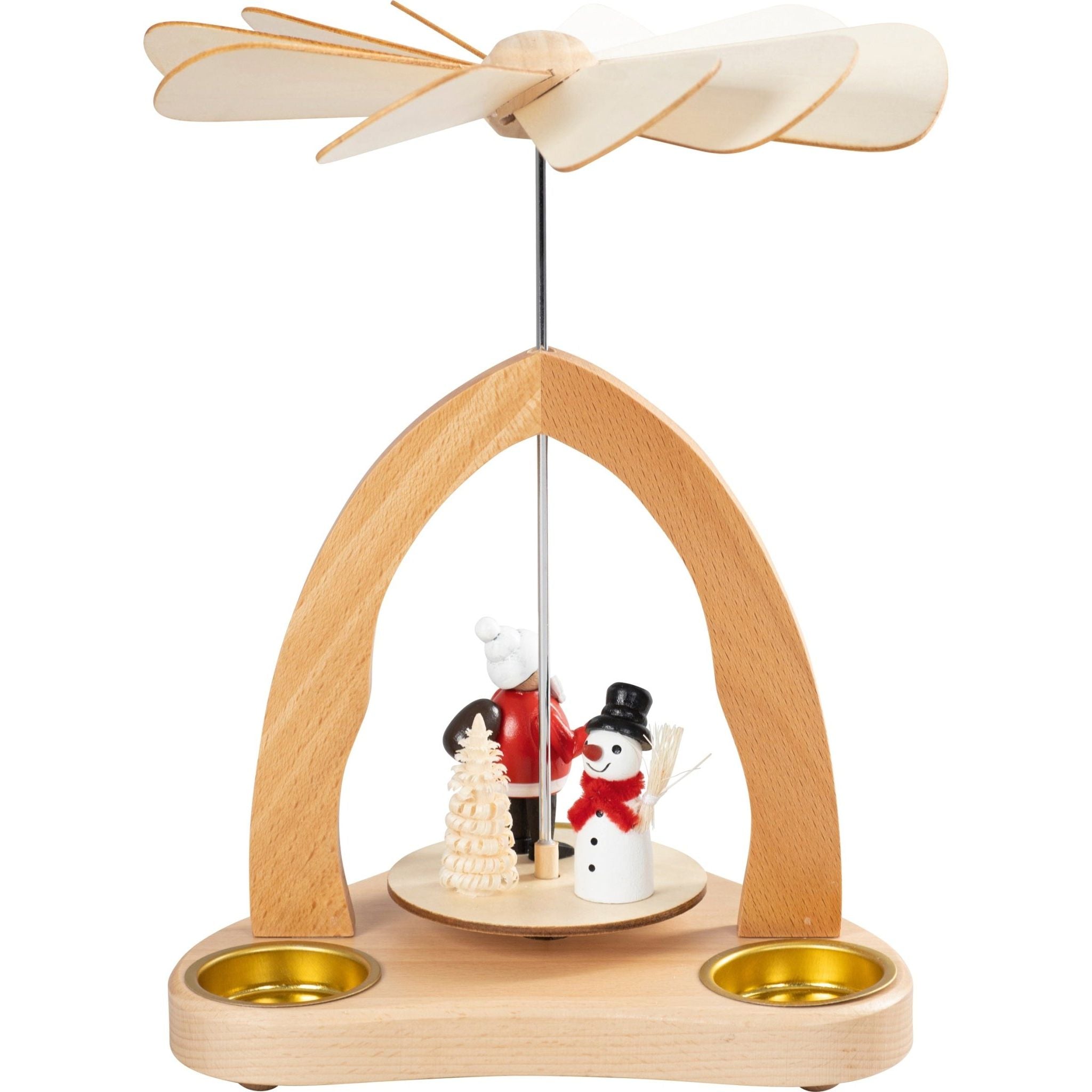 Diese Weihnachtspyramide für 3 Teelichte ist eine schlichte Mischung aus modernem und klassischem Design. Auf der einen Seite ein sehr klassisches Motiv, auf der anderen Seite die moderne Variante als Teelichtpyramide. Das Motiv ist dezent gehalten: ein Weihnachtsmann mit seinem Sack und ein Schneemann mit Hut und Besen, zwischen den beiden steht ein kleines Ringelbäumchen.